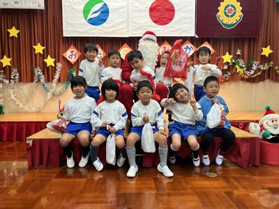 お楽しみ会楽しかったね 2025/12/15 園長 お楽しみ会をしました。 遊戯室にツリーを置き、手作りしたブーツを飾りました。 歌を歌ったり、踊りをおどっていたら・・・。サンタさん登場!! 子ども達は目を丸くしたり、わ~と歓声を上げたりしました。 ちょっとドキドキしたけど、サンタさんに質問しました。「どうしておひげが長いの?」 サンタさんは、「とっても寒いところに住んでいるから、おひげを長くしておくと温かいんだよ!」と教えてくれました。 サンタさんが持ってきた大きな白い袋から出てきたのは???子ども達へのプレゼント。一人一人に手渡ししてくれました。 とても嬉しい子どもたちでした! 最後にサンタさんと一緒に記念撮影。 「またクリスマスにおうちに行くかもしれないよ」と言って次の幼稚園へ出かけて行ったサンタさんでした。 子ども達にとって、とても嬉しい時間となりました。