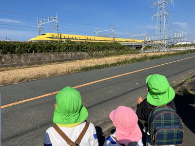 遠足 うさぎ山公園へ出かけました 2025/11/21 園長 遠足に出かけました。今回は園児のみで歩いての遠足です。 いつもは通らない、特別な道を通り、周りの景色を楽しみました。 途中で、おやつ休憩をしました。これもお楽しみの1つです。 道中、いろいろな秋を見つけました。「これは、すすきかな」 「あ!!」 「貨物列車が見えた!」 うさぎ山公園に到着。 赤色や、黄色に紅葉した葉っぱを見つけました。 あちこちにどんぐりが落ちていて、ここにも、ここにも!と夢中になって拾いました。 大きな遊具もあって、みんなで遊びました。 銀杏の木の近くで、記念撮影! お外で食べるお弁当は、特別おいしいね! 帰りには、途中でドクターイエローの新幹線が通り、子ども達は大喜び! たくさん歩いたけど楽しいこといっぱいで疲れを感じさせないくらい元気な子ども達でした。