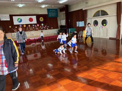 お楽しみ遊びは、全園児での「だるまさんころんだ」遊びです。年長児がリクエストした遊びです。